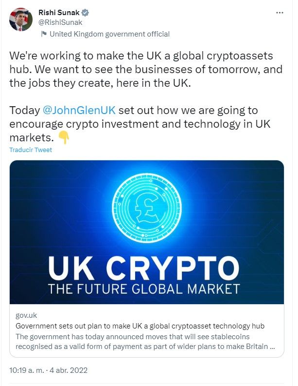 El Reino Unido está cada vez más interesado en el tema cripto y DeFi, así lo ha hecho saber su Primer Ministro Rishi Sunak quien en 2022 anunció que quiere que su país se vuelva un “hub para los criptoactivos”.