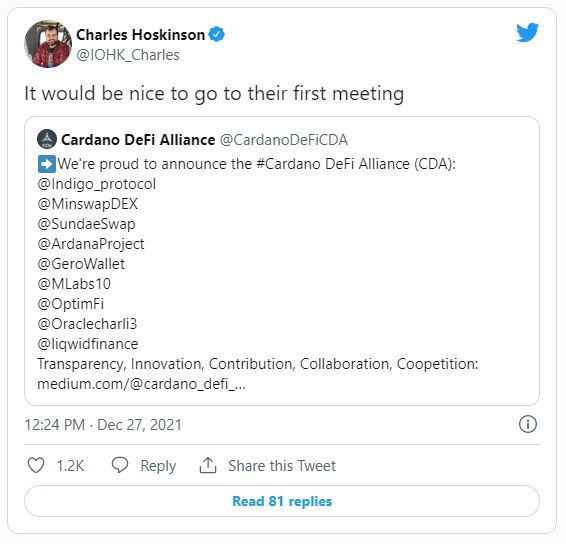 El creador de Cardano, Charles Hoskinson, se propuso revelar CDA en su perfil de Twitter este lunes 27 de diciembre, comentando que “sería bueno ir a la primera reunión de la organización”.