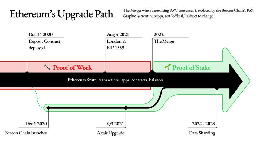 La fusión, cuando la cadena anteriormente conocida como Eth1 se acopla con la cadena anteriormente conocida como Eth2, está programada actualmente para el primer trimestre de 2022. Además, actualmente hay 9,1 millones de ETH en staking en Bacon Chain, valorados en alrededor de 21,7 mil millones de dólares a precios actuales.