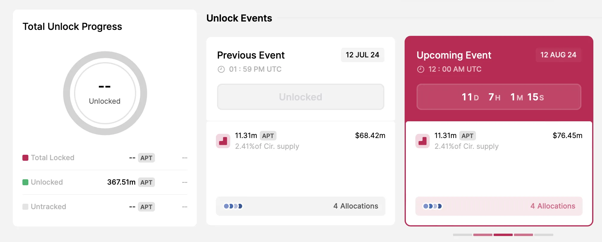 A continuación en la lista está Aptos, que distribuirá 11.31 millones de APT el 12 de agosto. El desbloqueo representa el 2.41% de su suministro circulante, con un valor aproximado de 76.45 millones de dólares. La liberación se dividirá de la siguiente manera: