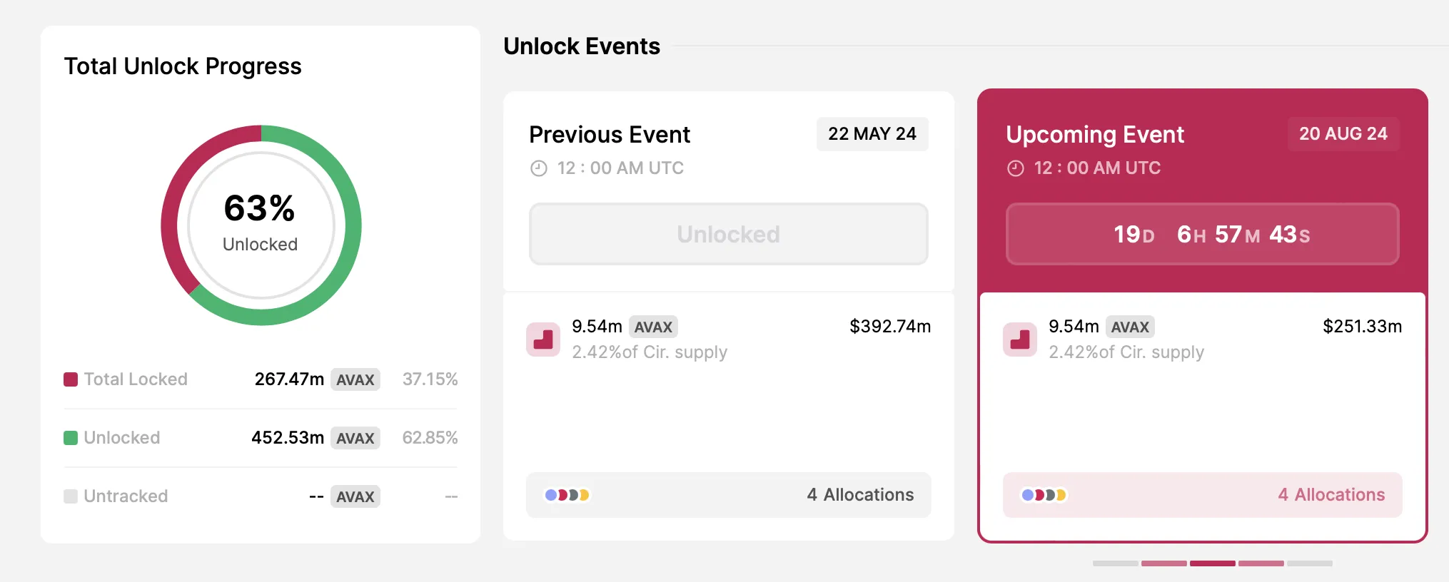 El mayor desbloqueo del próximo mes es AVAX. El 20 de agosto, Avalanche desbloqueará 9.54 millones de tokens, valorados en aproximadamente 251.33 millones de dólares. Esto representa el 2.42% del suministro circulante de AVAX. La distribución será la siguiente: