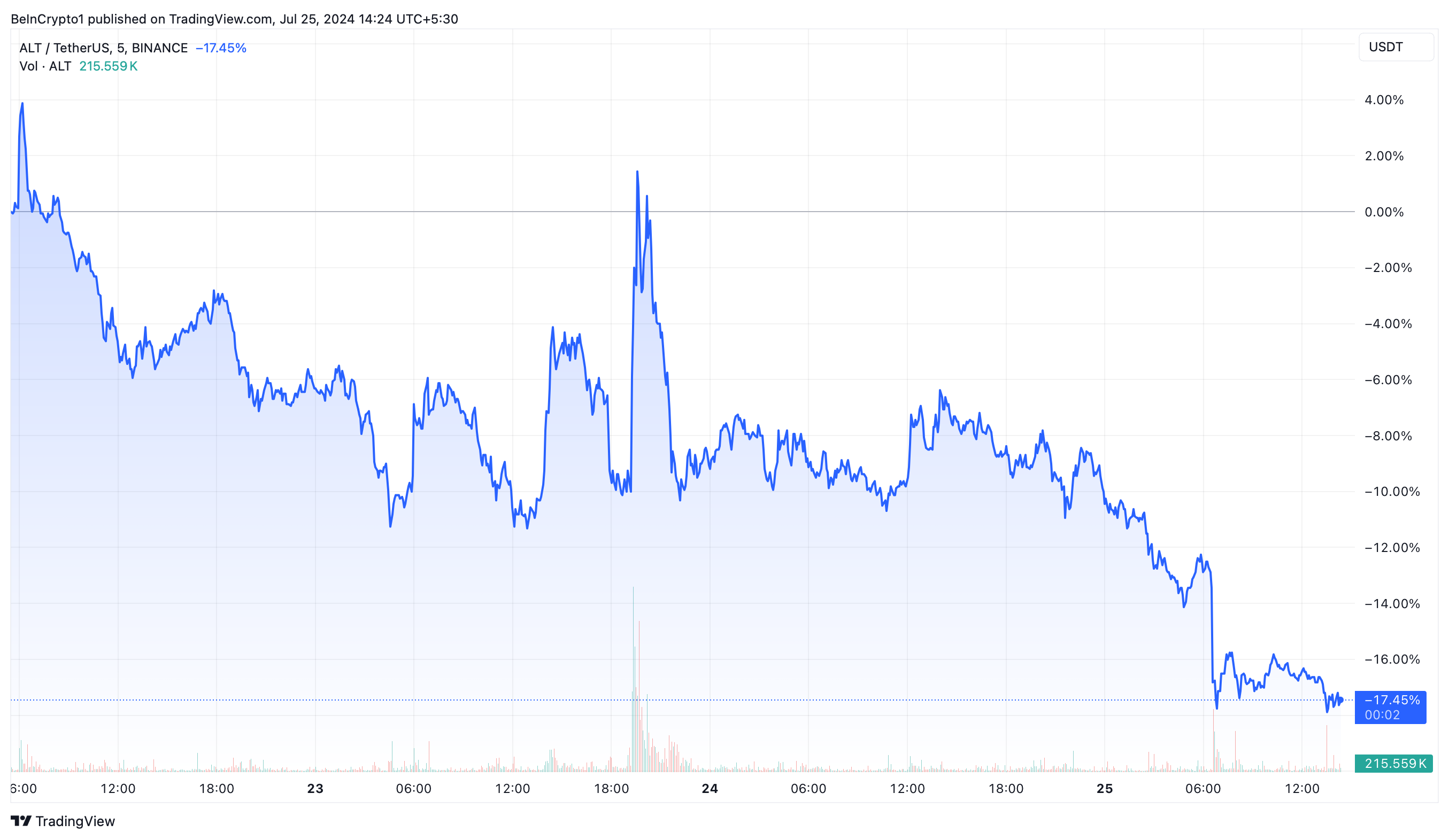 El token de AltLayer, ALT, ha experimentado una caída significativa, perdiendo más del 17% desde el lunes. Esta tendencia a la baja llega justo cuando la plataforma de escalabilidad blockchain se prepara para una liberación masiva de tokens.