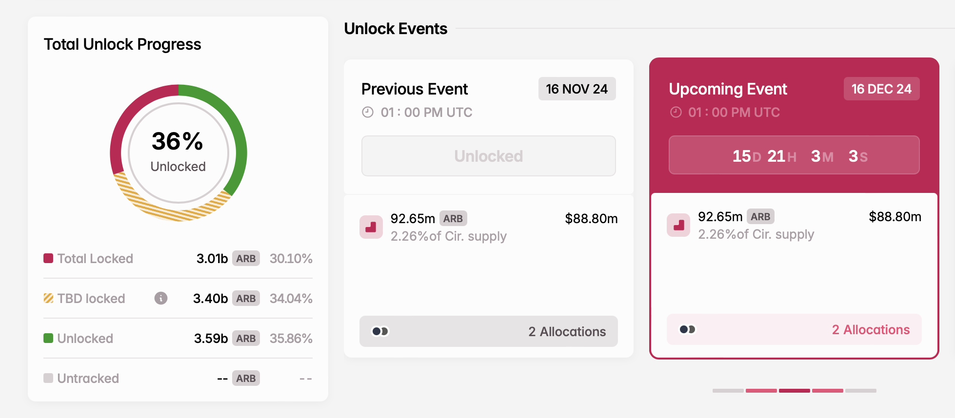 El 16 de diciembre, Arbitrum liberará 92,65 millones de tokens ARB, valorados en 88,80 millones de dólares. Este desbloqueo significativo representa el 2.26% del suministro circulante de ARB. La distribución de estos tokens será la siguiente: