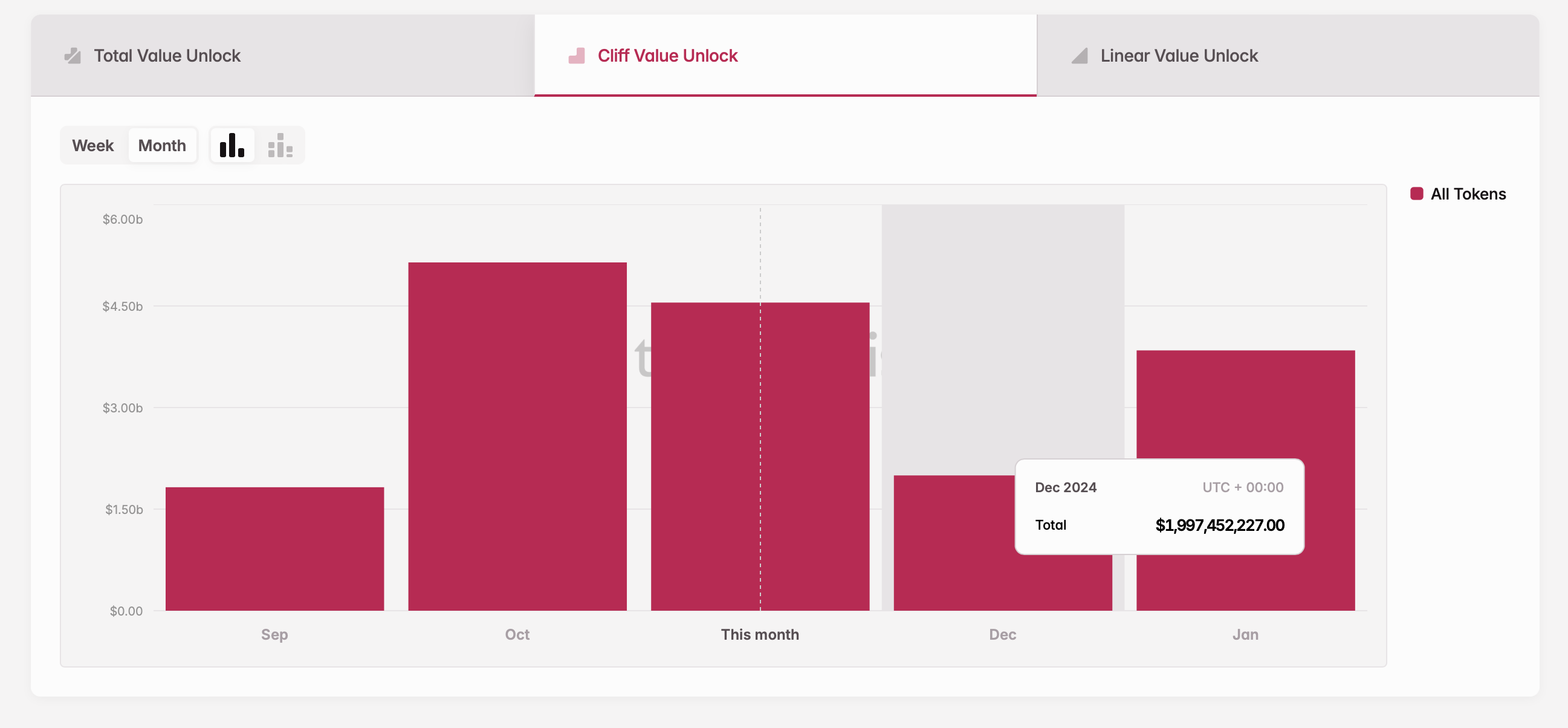 Tokenomist (anteriormente Token Unlocks) informa que 1,99 mil millones de dólares de los desbloqueos de tokens de diciembre están clasificados como desbloqueos cliff. En estos eventos, los tokens se liberan en un cronograma periódico, como semanal, mensual o anualmente, en lugar de diariamente.