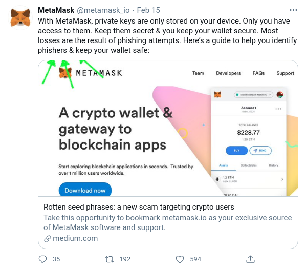 MetaMask, de igual manera que Ledger, ha publicado una guía sobre prevención de phishing y almacenamiento de claves privadas. Esto es de poco consuelo para los usuarios que ya han perdido criptomonedas debido a la actividad delictiva que involucra a estas plataformas.