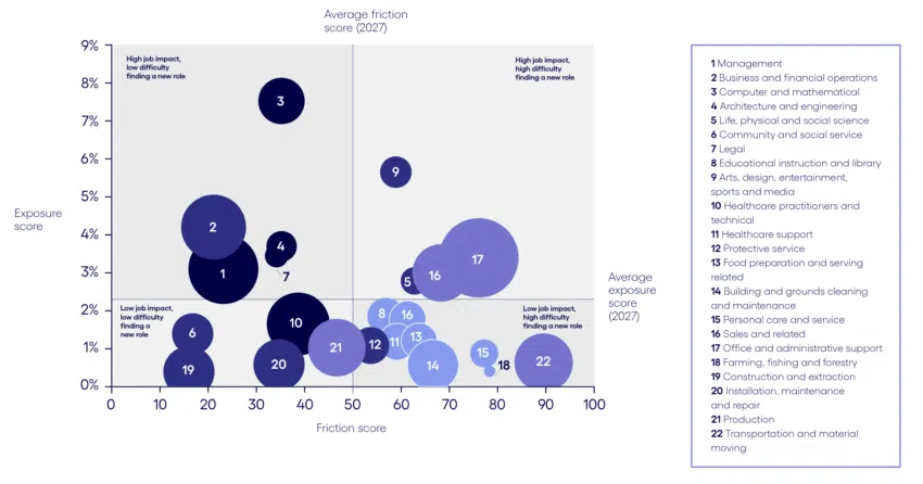 Los empleos actuales con un riesgo máximo de exposición del 50% a la automatización podrían ver cómo este riesgo aumenta hasta el 80% en 2032. Por ello, esta evolución tecnológica exige un enfoque proactivo. Las empresas y las personas deben adaptarse para aprovechar las ventajas de la IA y, al mismo tiempo, mitigar sus riesgos.