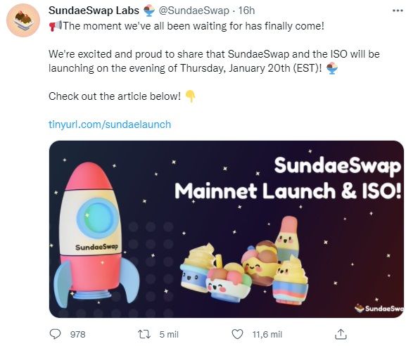 A través de una publicación de blog del 15 de enero, SundaeSwap confirmó que el lanzamiento en la mainnet de la versión beta totalmente funcional será el próximo 20 de enero.