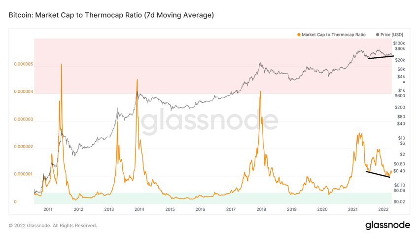Market cap to Thermocap ratio es una métrica on-chain que mide el valor de mercado de BTC en relación con el gasto de los mineros. En pocas palabras, mide si BTC tiene una prima o un descuento en comparación con la cantidad total que han gastado los mineros.