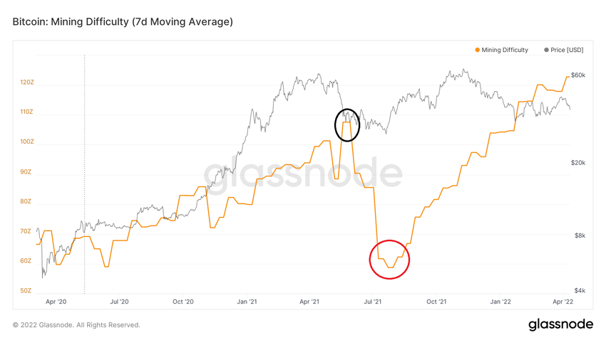 SponsoredTras el tercer halving (línea de puntos), la dificultad aumentó hasta el 29 de marzo de 2021 (círculo negro). Después, cayó bruscamente.