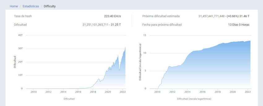 El aumento de dificultad más reciente fue del 4,89%, con un tiempo de bloque promedio de nueve minutos y 32 segundos, lo que requirió 223,7 exhashes por segundo de potencia informática.