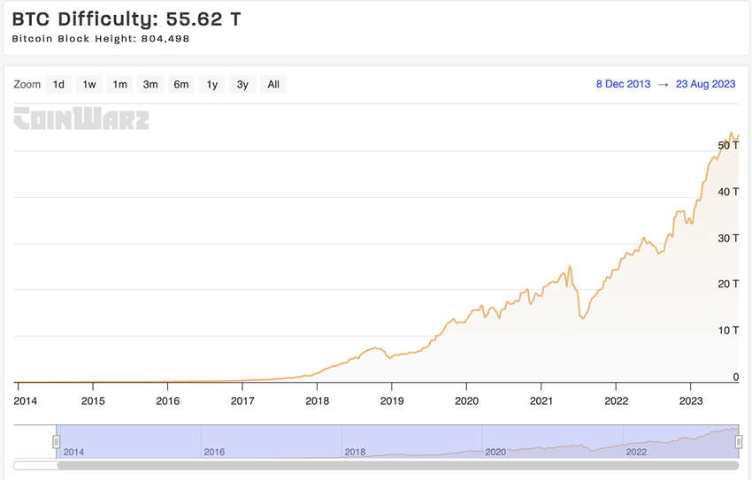 Según datos de Coinwarz, la dificultad de minería de Bitcoin es de 55,62 TH/s tras la reciente caída del precio de BTC.