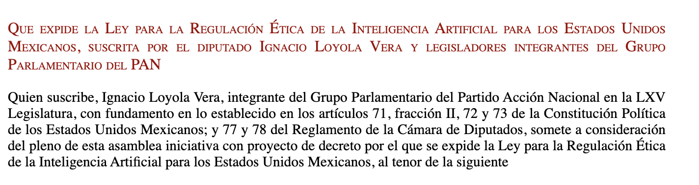Sponsored“Al amparo de las leyes mexicanas y, sin violación alguna, es que se presenta la siguiente propuesta por la cual se expide la Ley de Regulación Ética de la Inteligencia Artificial y la Robótica, en un marco normativo apegado a derecho y, con la urgente necesidad de comenzar a normar este nuevo reto al que se enfrenta el México contemporáneo”.