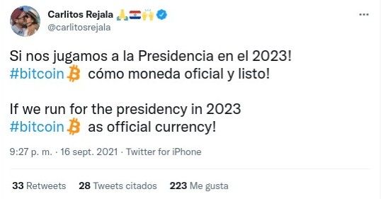 Carlitos Rejala, el diputado paraguayo que propuso un proyecto de ley para legalizar y regular el uso de Bitcoin y criptomonedas en Paraguay, anunció a través de Twitter que Bitcoin podría convertirse en moneda de curso legal en caso de ganar la presidencia de la nación sudamericana.
