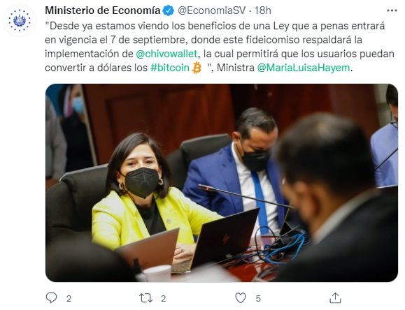De acuerdo a un tweet publicado por el Ministerio de Economía de El Salvador, la ministra María Luisa Hayem señaló: