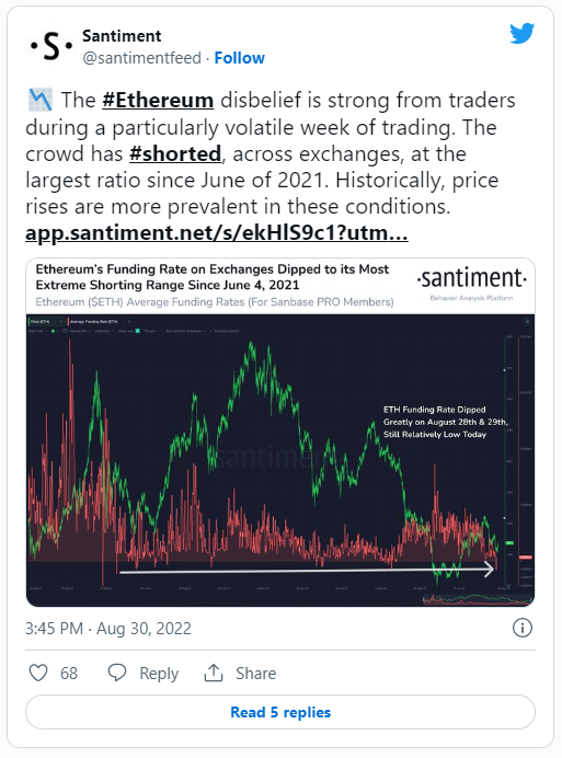 Varios analistas predicen que la Fusión (The Merge, en inglés) conduciría al repunte de ETH, los inversores actualmente podrían estar buscando comprar el activo antes del rally.