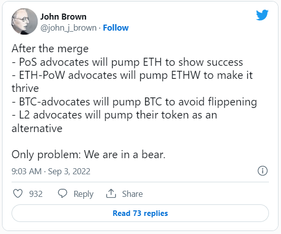 “Probablemente haya un mayor potencial para un evento de venta de noticias en la Fusión. También podría tener un problema técnico. No solo [eso], sino que hay muchas preguntas sobre qué harán las aplicaciones si Ethereum se divide nuevamente”.
