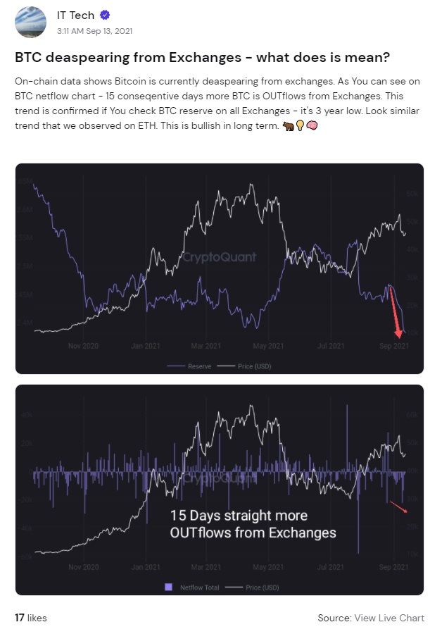 Sponsored“Los datos on-chain muestran que Bitcoin actualmente está desapareciendo de los exchanges. Como puede ver en el gráfico de flujo neto de BTC: 15 días consecutivos más BTC son salidas de los exchanges. Esta tendencia se confirma si verifica la reserva de BTC en todos los exchanges: es el mínimo de 3 años. Mira una tendencia similar a la que observamos en ETH. Esto es optimista a largo plazo. 🐂💡🧠”.