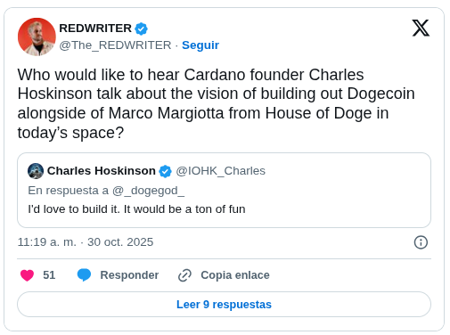 El fundador de Cardano, Charles Hoskinson, ha reiterado su compromiso de actualizar Dogecoin y ha destacado su potencial para convertirse en la moneda estándar de X.