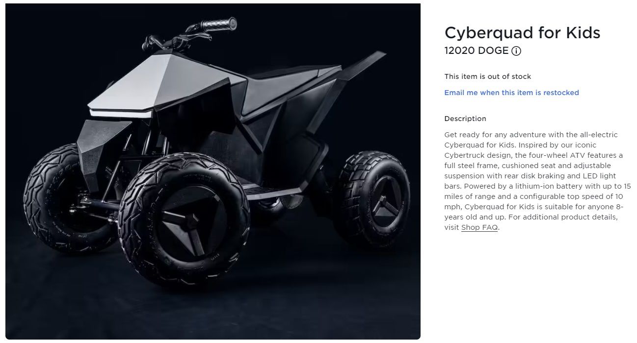 Según la página web de Tesla, los clientes ahora pueden optar por comprar una selección de artículos usando Dogecoin, incluidas hebillas de cinturón de la marca Tesla (835 DOGE o 159 dólares) y vehículos todo terreno para niños (12,020 DOGE o 2,283 dólares), que actualmente están agotados.