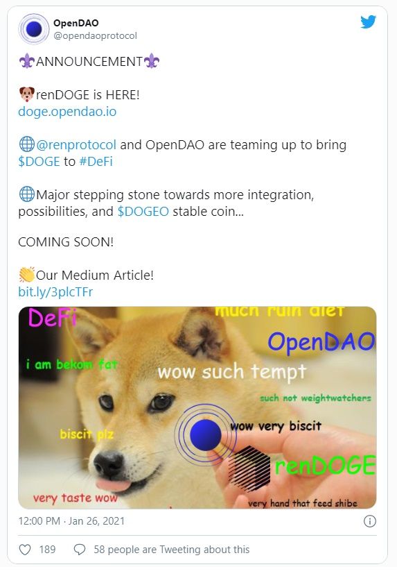 En una colaboración continua con el protocolo de wrapping de tokens Ren, OpenDAO ha permitido que Dogecoin se utilice como garantía para acuñar una stablecoin con un tema de perrito y vinculada al dólar llamada DOGEO.