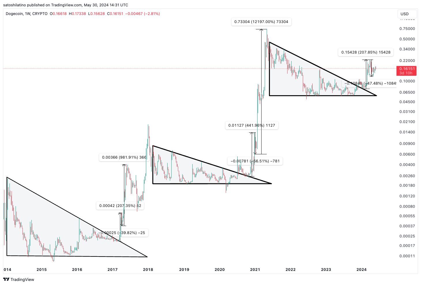 La reciente acción del precio de Dogecoin se alinea con los patrones históricos, lo que sugiere una potencial reversión alcista. Los datos históricos de 2017 y 2021 muestran que Dogecoin a menudo sigue rupturas de triángulo descendente con ganancias sustanciales.