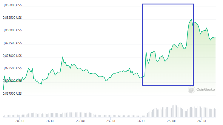 Sin embargo, el precio de Dogecoin parece estar regresando a la normalidad. Desde el pump ocasionado por el magnate (recuadro púrpura) que lo impulsó hasta los 0.0834 dólares, DOGE ha caído levemente y cotiza en 0.0788 dólares, según datos de CoinGecko.