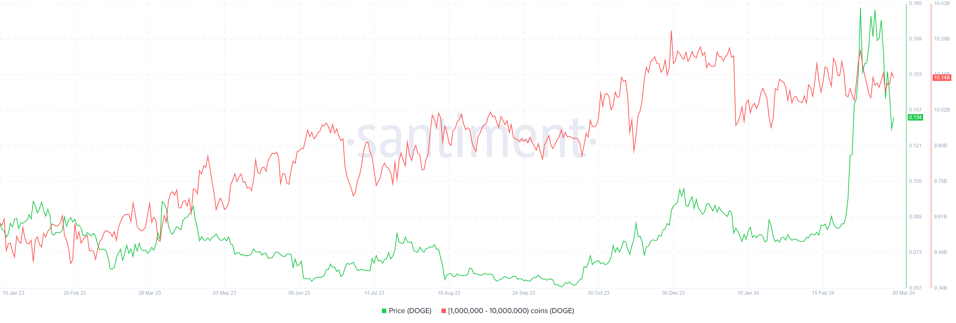 El precio de Dogecoin cayó más de un 26% en los últimos diez días después de que la memecoin repuntara hasta los 0.178 dólares, marcando un máximo de 26 meses. En el momento de escribir estas líneas, la altcoin cotiza en 0.134 dólares.