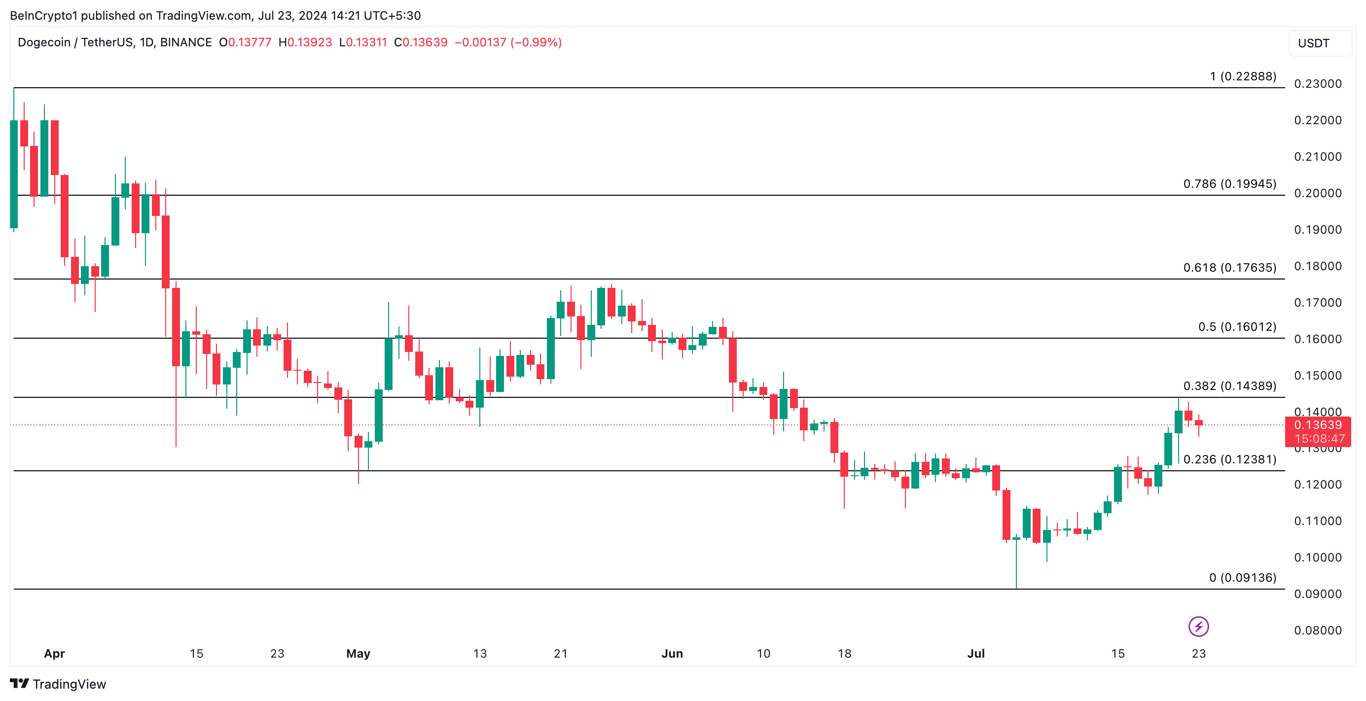 Sin embargo, si la cruz de la muerte resulta ser una señal falsa y el sesgo alcista hacia DOGE persiste, su precio podría aumentar hasta 0.14 dólares.