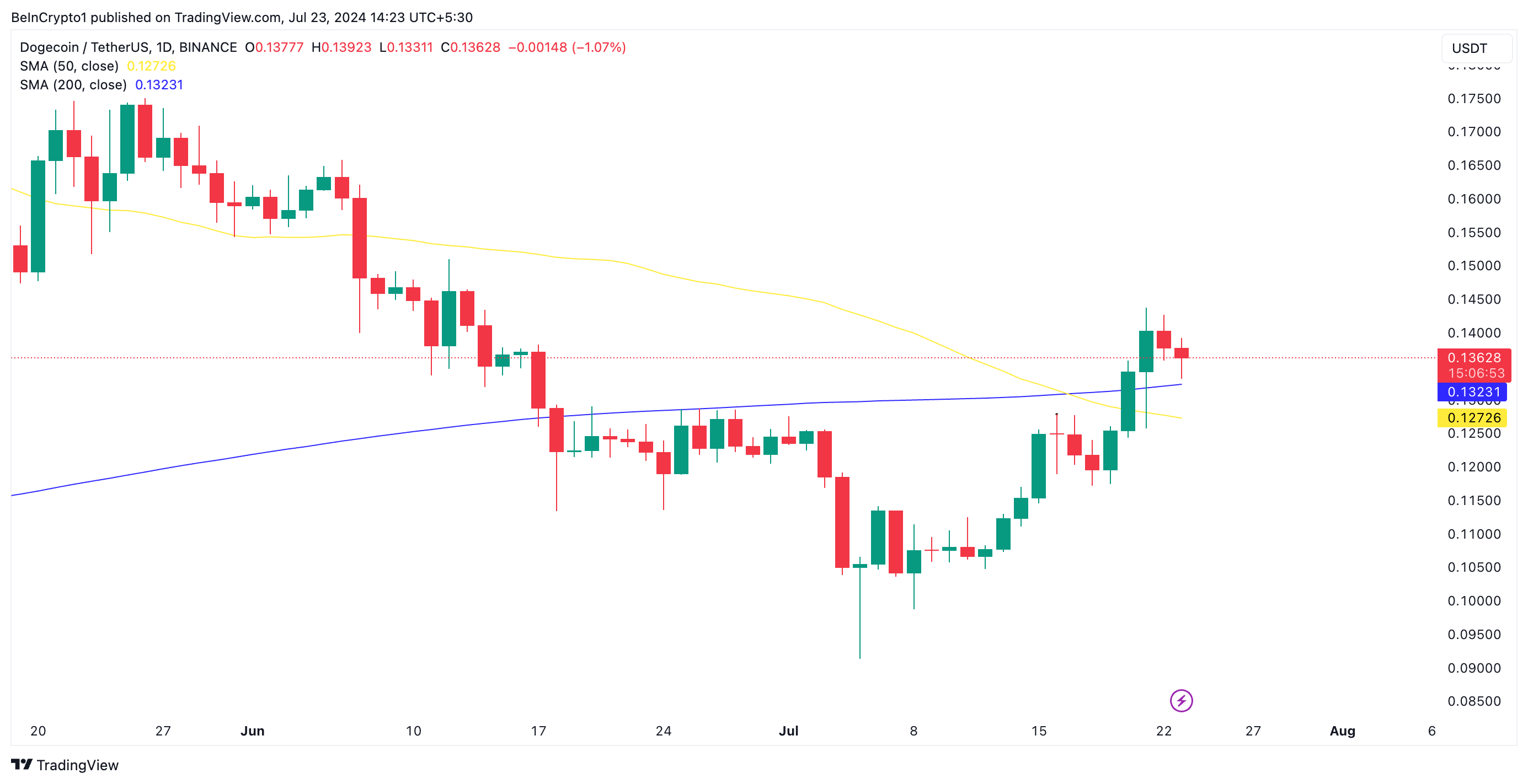 Las lecturas del gráfico diario de Dogecoin muestran que el 17 de julio, su media móvil simple de 50 días (SMA) (línea amarilla) cruzó por debajo de su SMA de 200 días (línea azul).