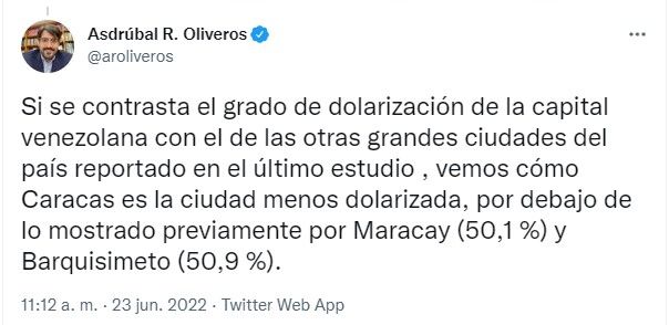 Este estudio fue realizado en varias ciudades del país y demostró que Caracas, la capital, es la ciudad que está menos dolarizada de todas con 48.8% de las transacciones hechas en dólares, un dato bastante alejado del 50% de Maracay o de octubre del 2021 cuando esa cifra alcanzó el 59.8% de las transacciones.