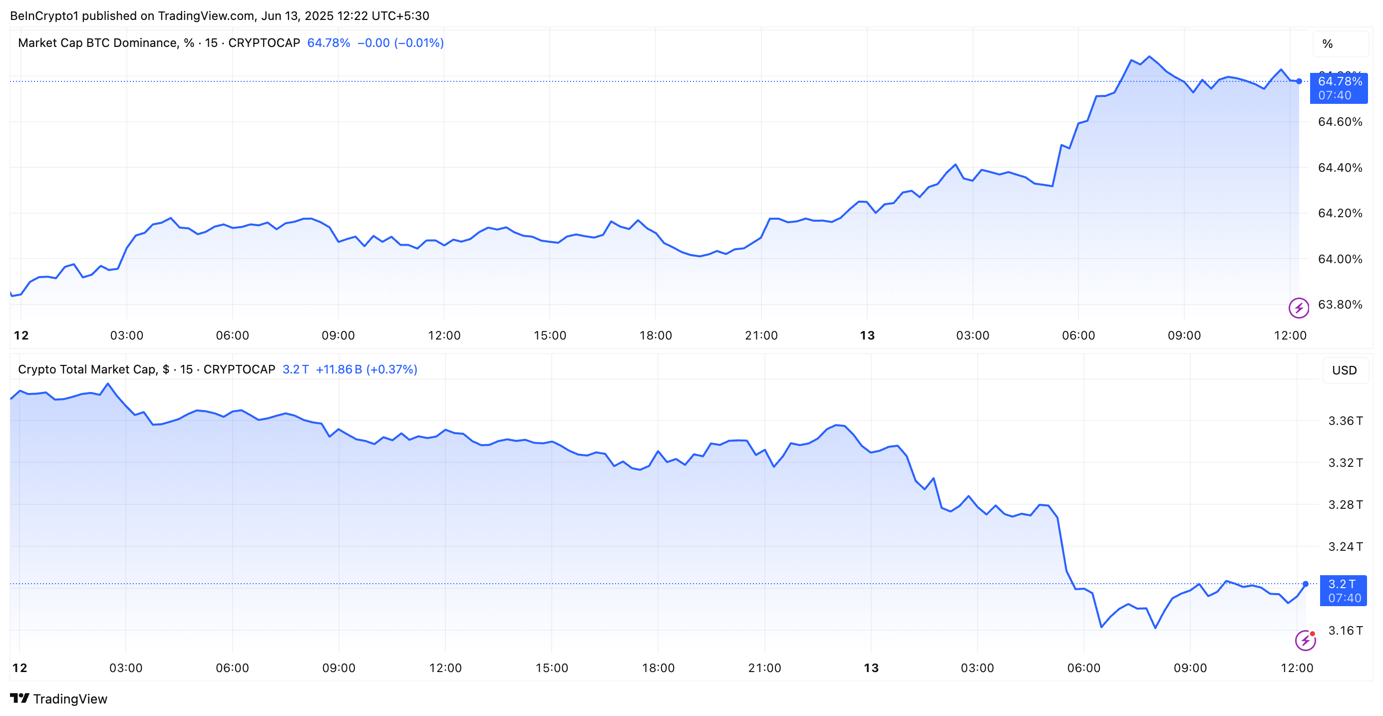 El conflicto en curso entre Israel e Irán ha afectado gravemente a los mercados de acciones y criptomonedas, pero no al Dominio de Bitcoin (BTC.D). Desde ayer, la capitalización total del mercado ha caído alrededor de un 6%.