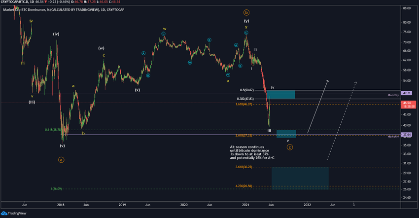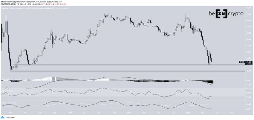 Hay dos zonas principales de soporte en el 39,50% y el 36%. Después de rebotar en la primera, el BTCD ha vuelto a ese nivel. Este último es el mínimo histórico del BTCD.
