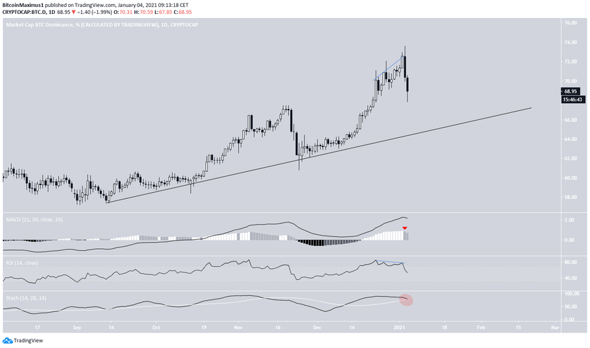 El gráfico diario muestra que el BTCD ha estado siguiendo una línea de soporte ascendente desde que el movimiento ascendente comenzó a principios de septiembre. La línea está actualmente cerca del 66%.