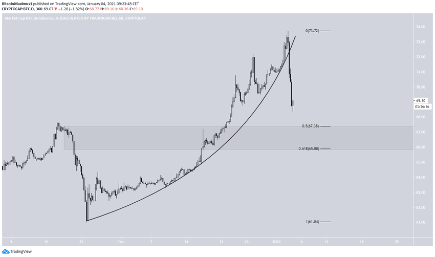 Mientras que el BTCD alcanzó un máximo de 73,63% el 3 de enero, procedió a disminuir bruscamente después. Dejó una larga mecha superior en su estela y se cerró por debajo del área de resistencia del 71,5%.