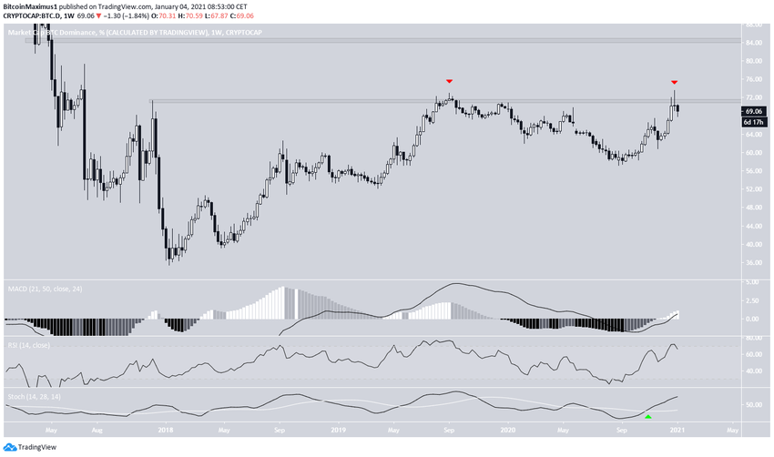 La Tasa de Dominio de Bitcoin (BTCD) ha sido rechazada por el área de resistencia a largo plazo del 71,5%, creando una mecha superior larga y cerrándose por debajo del área.