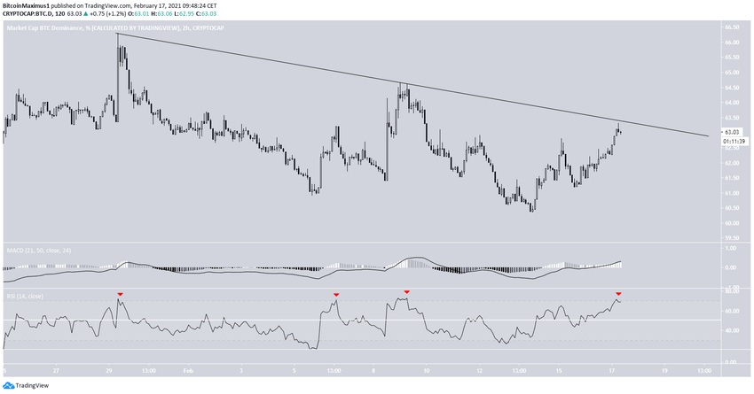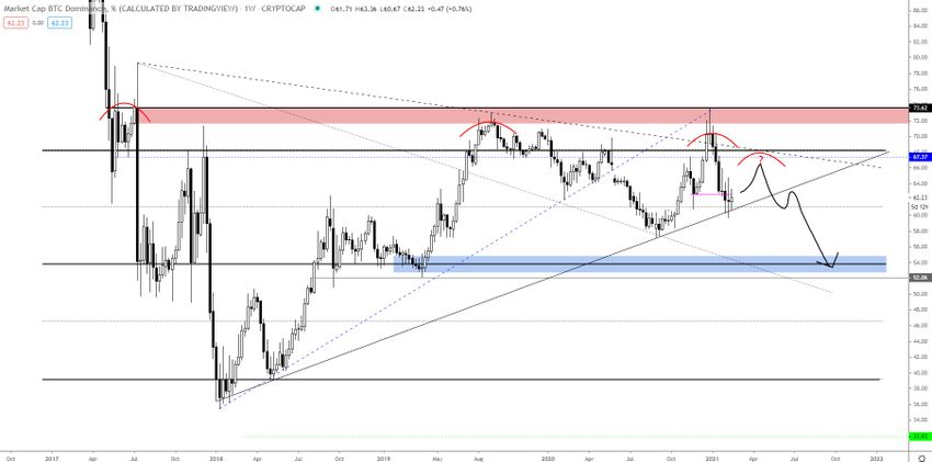 Aunque el índice de dominio de Bitcoin parece estar rebotando a corto plazo, se espera que acabe cayendo y disminuyendo gradualmente hacia los niveles de soporte.