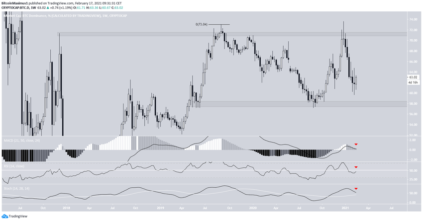 El gráfico semanal muestra que el índice de dominio de Bitcoin se ha movido a la baja desde que alcanzó la zona de resistencia del 71,5% en enero de 2021. El BTCD no ha cotizado por encima de este nivel desde 2017.