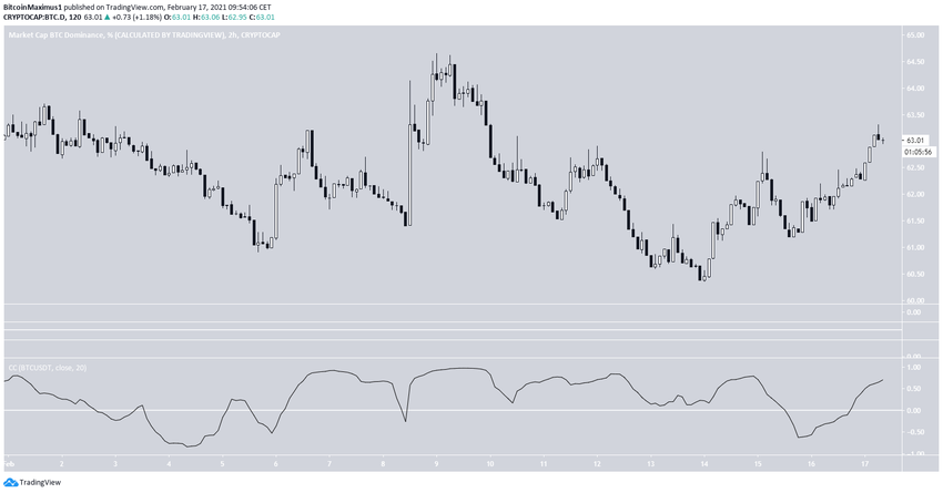A lo largo de febrero, BTCD y el precio del Bitcoin (BTC) han tenido una correlación positiva. Esto significa que un aumento del precio del BTC provoca un aumento del BTCD.