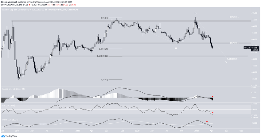 A largo plazo, se espera que el BTCD siga moviéndose a la baja hasta alcanzar el nivel de soporte del 50%.
