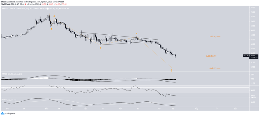 El gráfico diario muestra que el BTCD ha estado bajando desde la ruptura a la baja de un triángulo de cuarta onda el 28 de marzo.
