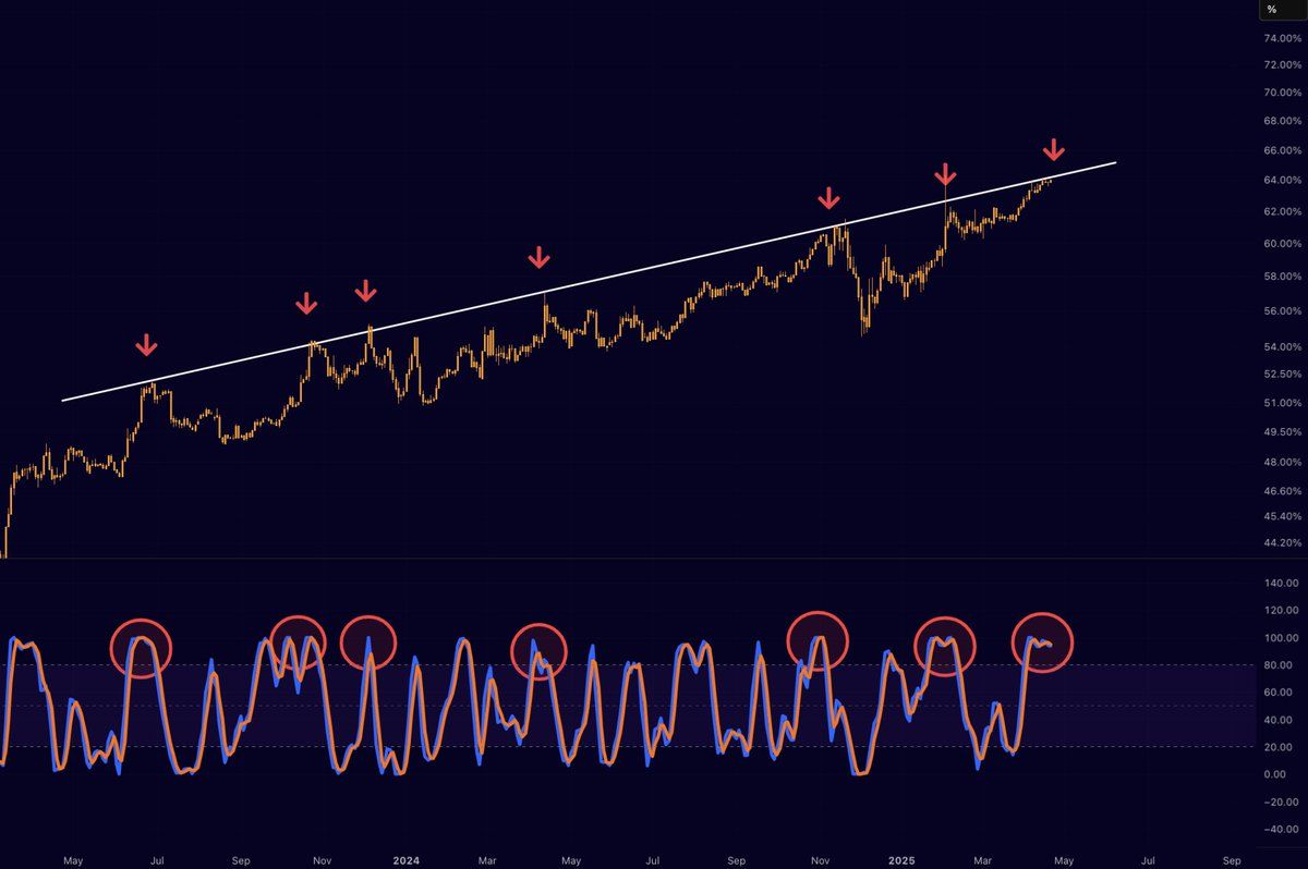 Muchos analistas están pronosticando un retroceso en la métrica. Mister Crypto, por ejemplo, señaló que BTC.D parece estar listo para un rechazo en una línea de tendencia importante. Este nivel de resistencia es significativo porque, históricamente, el dominio de Bitcoin ha tenido dificultades para superarlo.