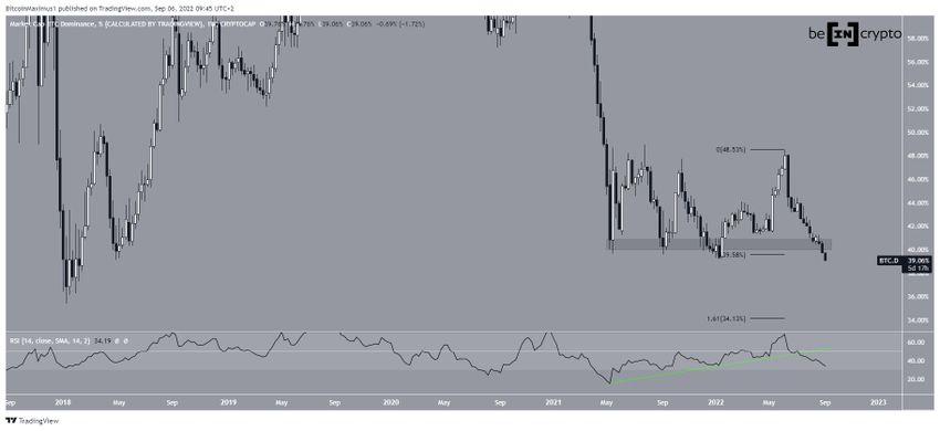 La BTCD ha estado cayendo desde entonces y alcanzó un mínimo local de 39.07% el 6 de septiembre, saliendo del área de soporte en el proceso. Además, el RSI semanal ha salido desde una línea de soporte ascendente (verde) que había estado vigente desde mayo de 2021. Ambos se consideran signos decisivos de una tendencia bajista.