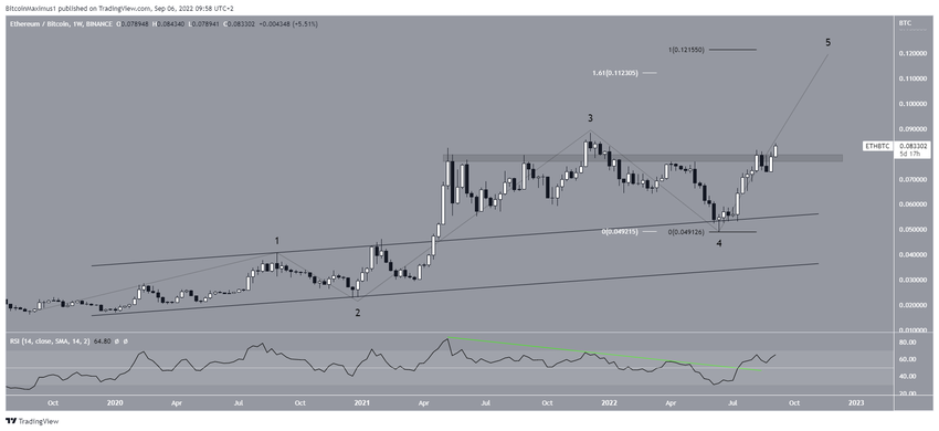 ETH/BTC se ha estado moviendo hacia arriba desde que alcanzó un mínimo de ₿0,049 en junio de 2022. Hasta ahora, el par alcanzó un máximo de ₿0,084 el 6 de septiembre. Este es casi el valor más alto para el par desde principios de 2018, con el solo el máximo más alto fue ₿0.088 alcanzado en diciembre de 2021.