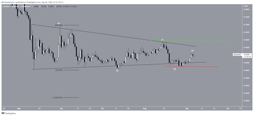 Si ADA supera el máximo de 0.594 dólares (línea verde) o se rechaza en el mínimo de 0.423 dólares (línea roja), probablemente determinará la dirección de la tendencia futura.