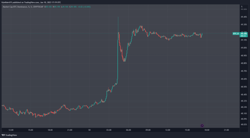 La tasa de dominio de BTC ha estado aumentando constantemente desde noviembre. Y aumentó rápidamente durante la crisis bancaria estadounidense de marzo. Tras el aumento del sábado, el dominio de bitcoin se encuentra en su nivel más alto desde 2021.
