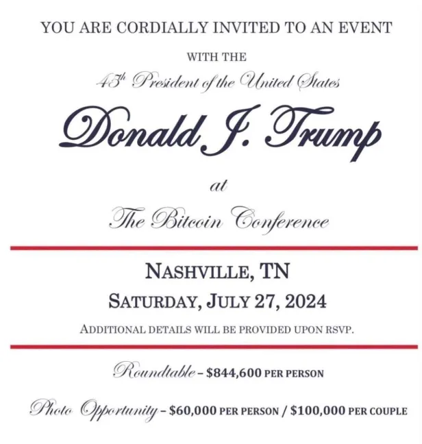 El expresidente de Estados Unidos, Donald Trump, ha establecido un alto precio para sus seguidores de la comunidad cripto: 844,600 dólares por un asiento en una mesa redonda privada durante la próxima Conferencia de Bitcoin 2024 en Nashville.