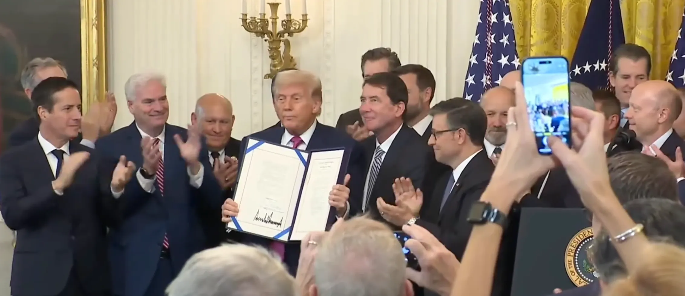 Trump firmó el proyecto de ley durante una sesión a puerta cerrada el viernes por la mañana. Mientras celebraba la victoria, bromeó con los reporteros, “Se llama GENIUS Act. Creo que lleva mi nombre.”