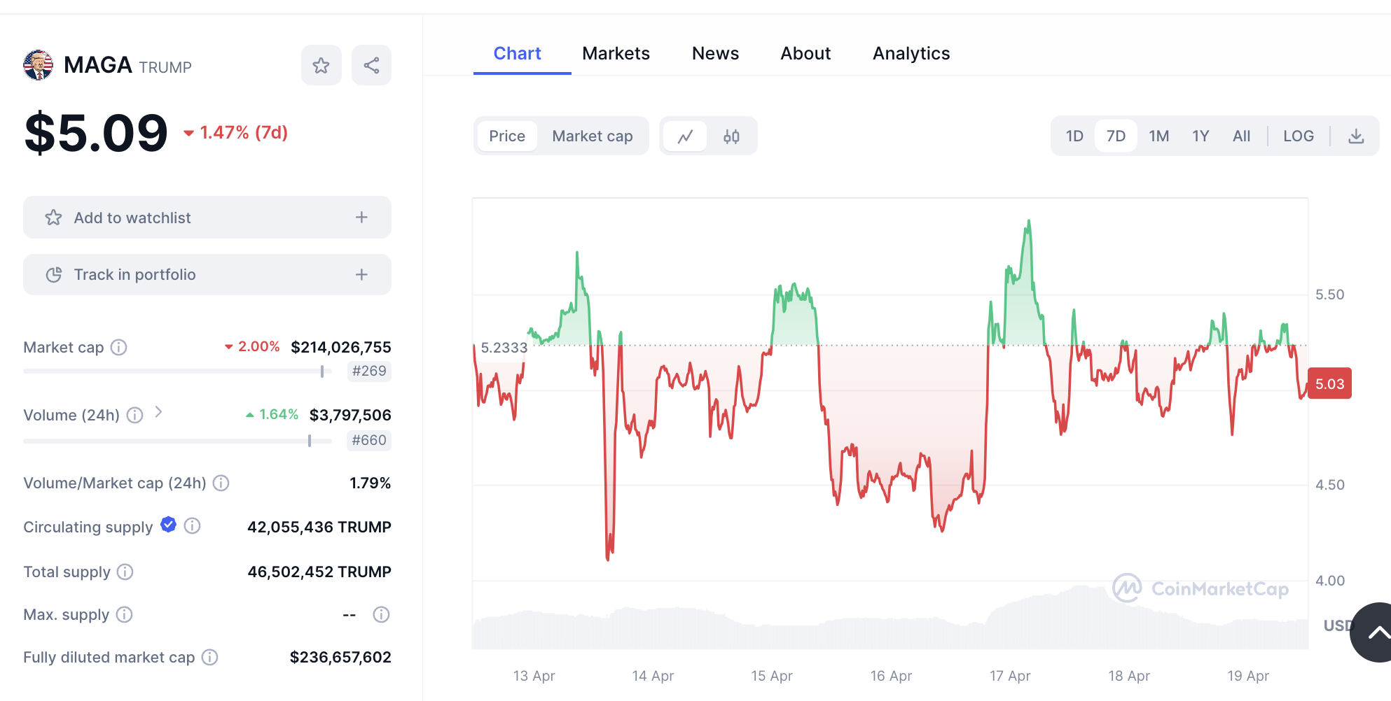 En la última semana, MAGA (TRUMP) perdió más de 15%, el cual se sumó a la pérdida de 12% que registraba desde marzo. Por ello, el ex presidente ha perdido más de un millón de dólares de valor en su portafolio cripto. Es decir, el 11 de abril, el portafolio valía 6,6 millones de dólares y para el 16 de abril había descendido a 5,4 millones de dólares. Y el 19 de abril vale 5,58 millones de dólares.