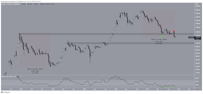 En junio de 2022, el precio de BTC rebotó en el área de soporte horizontal a largo plazo de 19,000 dólares (icono verde). Sin embargo, el rebote no tuvo éxito y el precio se derrumbó durante la semana del 7 al 14 de noviembre (icono rojo). Ahora se espera que el área de 19,000 dólares proporcione resistencia.