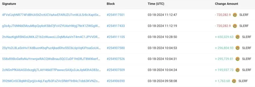 Durante un aumento significativo en el precio de criptomoneda meme, un trader vendió 1,43 millones de SLERF para recuperar lo que gastó originalmente. Como resultado, el beneficio neto del usuario ascendió a 961,165 SLERF, o 1,24 millones de dólares.